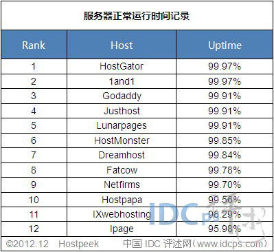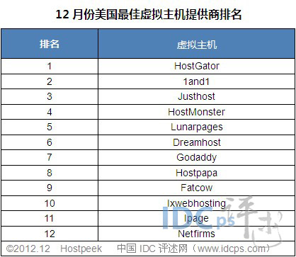 中國IDC評述網12月27日報道:近日,Hostpeek公布了12月份美國最佳性價比虛擬主機提供商。據最新測試數值顯示,HostGator表現最佳,各項測試數值均位居前列。而1and1和JustHost則繼續位列二、三名。