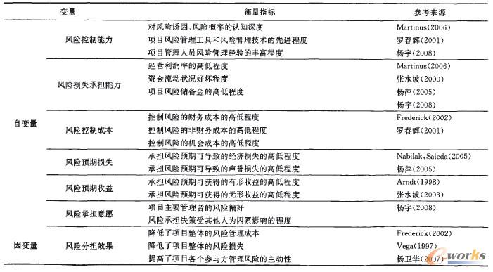 模型中將影響風(fēng)險(xiǎn)分擔(dān)效果的因素可歸為三類:①能力因素,②損益因素,③意愿因素。對(duì)這三類因素進(jìn)一步細(xì)化,歸納出了影響風(fēng)險(xiǎn)分擔(dān)過程及效果的六個(gè)重要因素:①承擔(dān)者對(duì)風(fēng)險(xiǎn)的控制能力,②承擔(dān)者承擔(dān)風(fēng)險(xiǎn)損失的能力,③承擔(dān)者應(yīng)對(duì)風(fēng)險(xiǎn)的成本,④承擔(dān)者承擔(dān)風(fēng)險(xiǎn)的預(yù)期收益,⑤承擔(dān)者承擔(dān)風(fēng)險(xiǎn)的預(yù)期損失,⑥承擔(dān)風(fēng)險(xiǎn)的意愿。根據(jù)提出的理論模型,下面將對(duì)這些因素與風(fēng)險(xiǎn)分擔(dān)效果的關(guān)系展開進(jìn)一步的實(shí)證分析。