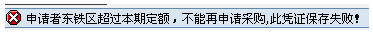 其次在ERP原有的采購申請創建環節,編寫代碼實現一組判斷及操作功能。具體業務流程是當業務人員創建一筆采購申請時,判斷此訂單所涉及物料是否納入定額管理,如果不是則不需要控制直截進入創建申請環節,如果是需要去判斷本申請者的本月定額余額(即定額總數減去已申請總數),如果余額大于本次申請金額,系統將允許創建訂單,反之提示本次申請超額并不允許創建申請。如查詢煉鐵廠東鐵區2009年12月剩余工礦材料剩余定額1082.6元,(如圖四所示),東鐵區再要上報3350元的除塵布袋,在保存時,系統給出提示: