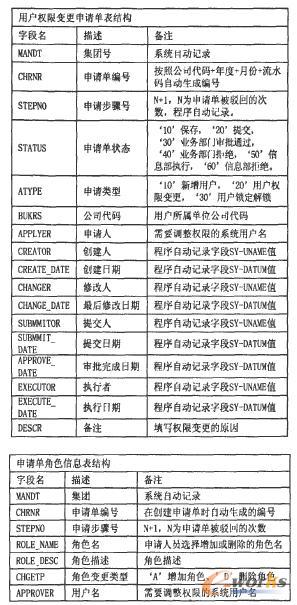 在權限變更模塊中所執行的每一步操作,都會在相關的自建數據庫表中產生記錄,由于流程的需要,一些表中的數據要相互關聯。用戶創建權限申請表結構舉例如下: