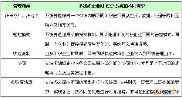 多組織化企業(yè)與單組織企業(yè)的管理相比,要復(fù)雜的多,多組織化企業(yè)必須要處理多任務(wù)廠之間的協(xié)同作業(yè),多組織之間的財(cái)務(wù)核算,資金流、物流、信息流、工作流分離的管理模式等問(wèn)題,而這些管理要求也造成了多組織應(yīng)用架構(gòu)的ERP與單組織應(yīng)用架構(gòu)的ERP系統(tǒng)之間最大的區(qū)別。當(dāng)然,如果是集團(tuán)化的多組織企業(yè),ERP還要能靈活的處理不同集團(tuán)企業(yè)的管控模式。