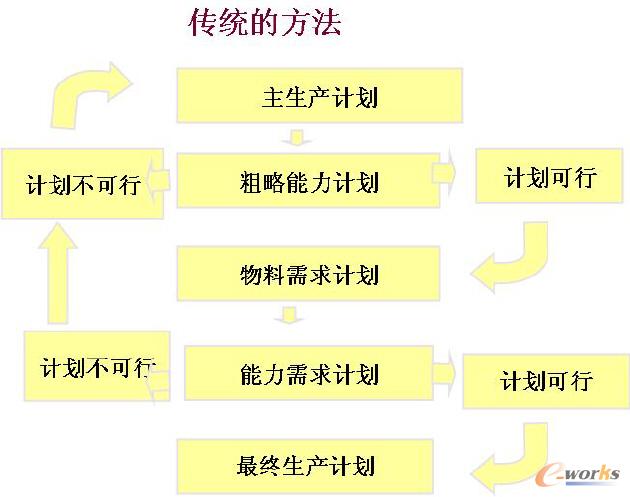 它是假設資源(機器、人員、物料)無限的計劃排程,是不可行的計劃排程,通過CRP能力需求計劃分析手工調整,計劃與執行的落差太大,不能匹配生產車間現場的資源產能與產線節拍。