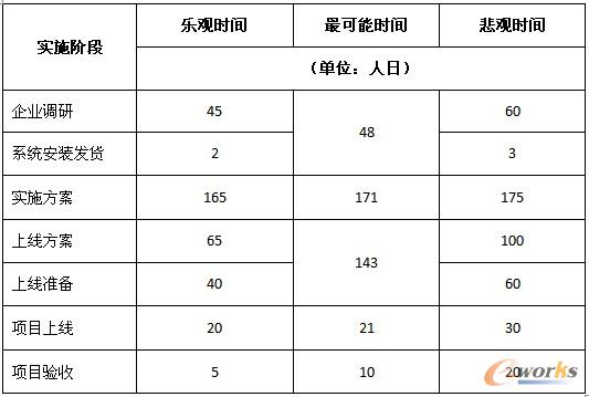 2、各階段樂觀時間、最可能時間和悲觀時間(沒有計算客戶人日)估算如下: