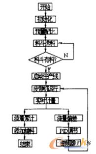 配料控制單元主要是以PLC、接觸器/繼電器低壓控制電路、觸摸屏為主體構(gòu)成的配料控制系統(tǒng)。PLC是整個配料系統(tǒng)控制的核心。它的控制流程圖如下: