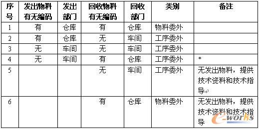 委外加工一般指的是其他企業(yè)根據(jù)本企業(yè)的零件加工要求,生產(chǎn)制造出符合要求的零部件或產(chǎn)品,往往需要企業(yè)提供材料或技術(shù)圖紙等。根據(jù)委外加工件材料的提供單位不同,可以分為帶料加工和不帶料加工;委外加工件回收也可以分為回倉庫和回車間兩種情況,回倉庫時一般對應的物料設(shè)置有物料編碼,回車間時物料往往是需要在車間繼續(xù)加工后才形成需要的零件。對于從倉庫發(fā)料,委外加工完成后依然回倉庫,也就是生產(chǎn)此物料的所有工序都由委外加工商進行處理的情況,一般將其稱為物料委外;而對于有部分工序在企業(yè)車間進行生產(chǎn)的,可以稱其為工序委外。根據(jù)發(fā)出物料和回收物料有無編碼的不同,可以歸納為以下幾種情況: