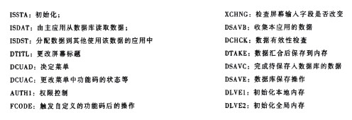 屏幕顯示的基本要素是視圖(View),實際上就是子屏幕。通過調用函數BUS_PBO和BUS_PAI實現PBO和PAl,并規范PBO和PAI的程序。主要的流程控制、屏幕顯示以及各種檢查和缺省都在視圖的程序中。通常一個視圖內的字段是一個字段組.通過基于字段組的輸出控制配置功能實現基于不同條件下的屏幕輸出控制。