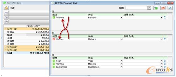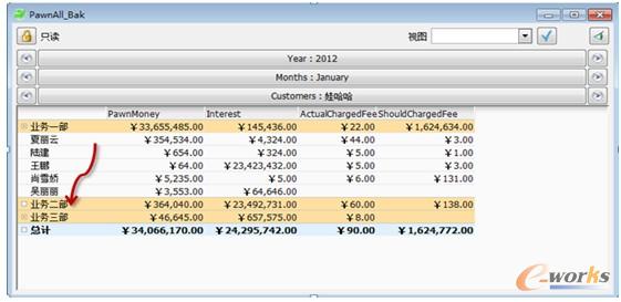 ⑨ 對典當金額排名,季度金額占比,客戶的關系等,在客戶金額占比上進行鉆取,明列出詳細的Cube數據,可進行維度調整,在B/S模式上,也可進行用戶自定義圖表: