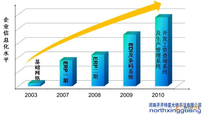 隨著企業(yè)信息化和汽車行業(yè)的發(fā)展,2008年到2010年銷售收入有了較大的增長,客戶遍及全國各地。開開特星光鎖業(yè)從2003年開始信息化之路,信息化發(fā)展歷史是:2003年做了內(nèi)網(wǎng),2007年是ERP一期,2008年做了ERP二期,2009開始做了EDI的條形碼,2010年做了公司查詢系統(tǒng)和生產(chǎn)管理系統(tǒng)。