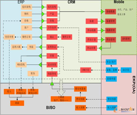 之后我們開始了CRM的實施,目標是建立、健全客戶視圖數據;強化銷售預算及線路活動;管理市場推廣和營銷活動;加強渠道的可視化管理;打造完整的客戶價值鏈;開啟銷售、市場全面分析。我們選擇了上海和河南的2個分公司,所涉及的業務就是包含了客戶管理、拜訪管理、資金管理、預案管理、資產管理、訂單管理、渠道進銷存、合同返利管理,CRM功能集中在營銷和銷售管理兩大模塊。CRM是從2010年的6月開始實施的,經過半年的時間,2010年底上線。在CRM實施的時候,三全食品已經實施了SAP的ERP系統,這就面臨著一個系統的集成問題,不僅僅是CRM,還有其他的系統也需要集成。圖3就展現了目前三全食品的系統集成情況。