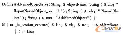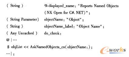 自定義KF函數AskNamedObjects_cs的第一個參數表示用戶輸入參數名,第二個參數表示動態鏈接庫名,第三個參數表示動態鏈接庫中的類名,第四個參數表示類中方法名稱。定義好KF函數后,就可以像NX系統自帶的KF函數一樣使用。