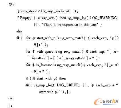 以上例子表達式驗證規則的KF代碼,用于檢查模型中的表達式是否系統自定義表達式、表達式名是否含有空格以及含有小寫字母等驗證規則。代碼中使用了很多系統提供的KF函數,比如Ug_mqc_askExps用戶查詢當前part中所有的表達式,ug_rexp_match檢查表達式正則匹配,ug_mqc_log給用戶報告驗證結果。
