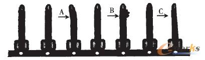 上述系統極為適合對大批量生產情況下工件的在線檢測,尤其是當被測對象尺寸較小、形狀比較簡單時,更能顯示其優越性。電子接插件、包括汽車電子產品中的接插件就是典型例子,它們的生產效率和成品尺寸精度都較高,前者可達到每分鐘數百件,而后者多數為0.01ram的數量級。一般情況下,工件質量缺陷包括插腳的變形或扭曲、多余的金屬粘附(金屬碎屑)等,均反映為外形尺寸的誤差。當采用圖l所示系統進行測量時,零件(插腳)所形成的圖像由于與其明亮背景之間的強烈對比,而具有清晰的剪影效果。這樣的理想圖像為準確測量被檢對象的尺寸和輪廓(形狀)特征創造了條件。圖2顯示了一部分沖壓成形的插腳隨著金屬輸送帶通過檢測工位時產生的典型背光圖像。其中,插腳A發生了扭曲,插腳B上粘附著多余的金屬,插腳C斷面尺寸(寬)不合格。