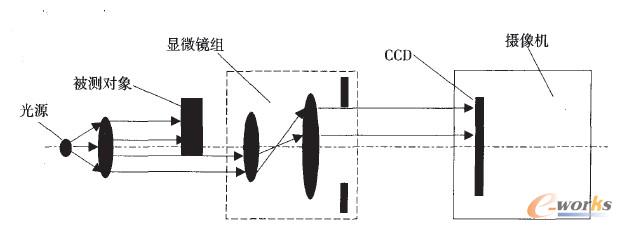 精密測量是機器視覺一個重要的應用領域,其對被測對象進行測量的原理如圖1所示。檢測系統主要由光學系統、CCD攝像頭和計算機處理系統(圖中未表示)等組成。由光源發出的平行光束照射到被測對象的檢測部位上,其邊緣輪廓經過顯微光學鏡組成像在攝像機的面陣CCD像面上,經計算機進行圖像處理后獲得被測對象邊緣輪廓的位置。如果使被測對象產生位移,再次測量其邊緣輪廓位置,則兩次位置之差便是位移量。顯然,若被測對象的兩條平行的邊緣輪廓能處于同一幅圖像內,則其二者位置之差即為相應尺寸。
