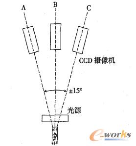 根據被測對象的特征(工件形狀、被測部位)和要求,參照視覺系統產品的有關標準,并按照所完成的設計,將能方便地選取合適的圖像檢測單元(器件),組成相應的檢測系統。以連桿結合面爆口為例,其系統的檢測要求如圖4所示,即分別檢測互為15。夾角的A.B.C三個(連桿側面的)破口面,最終以三個檢測結果中的最大值作為破口的真實值,進行判斷后并輸出結果。圖5為該系統組成示意圖,其中:
