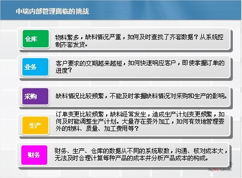 基于以上需求和問題,中瑞公司領導層認為:企業現有管理以及使用系統已無法實現信息的集成與共享,更難以適應多樣化市場的競爭需要,為此,公司決定引進ERP企業資源計劃管理系統,以建立快速的信息獲取、處理和響應機制,改革企業傳統的生產組織模式和管理方式,優化企業的業務流程和資源配置,努力降低產品成本,不斷開發出貼近市場需求的新產品,為客戶提供最優質的產品、最優良的服務,以適應配套市場競爭需求。