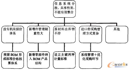 設備制造廠計算機管理技術在生產與經營管理方面的應用方面也顯得比較薄弱,僅在工裝產品的訂貨和生產計劃的制定、組合機零件清單的制定上有一定的應用。為了改變這種狀況,設備制造廠在1997年開始進行MRP-II軟件的選型,并與美國的SYMIX公司達成協議,希望通過他們的SyteLine軟件改變工廠生產經營管理信息系統的狀況,由于種種原因,諸如推行力度不大、有關部門抵制、產品品種多、BOM(物料清單)難以建立、軟件的本土化工作不夠、尤其是財務系統不符合中文習慣等等,導致軟件沒有實施成功。在此次ERP系統面臨具體的業務中,以沒有機床報價體系、新增件管理隨意性大、進口件管理環節繁瑣、原材料出庫物不符等一系列典型的問題急需要作為基礎問題解決,如圖6所示: