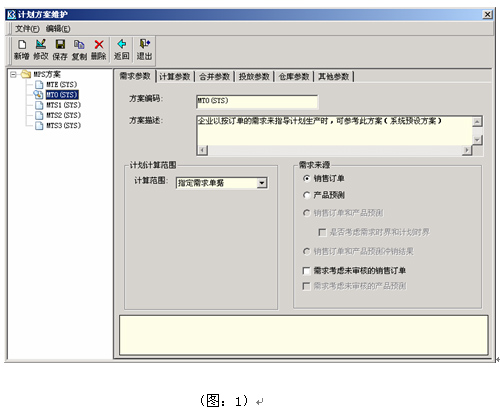 1) 在MRP計算時,計劃方案中選擇MTO,計算范圍為“指定需求單據(jù)”,需求來源為“銷售訂單”,如圖:1所示。然后選銷售訂單SO01進(jìn)行運算,系統(tǒng)產(chǎn)生100PCS的LCC01的“計劃訂單”;