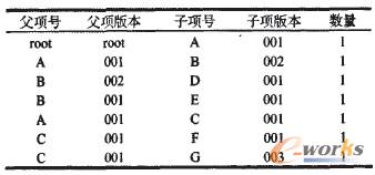 (2)零部件關(guān)系表的建立。基于單層BOM原理,零部件關(guān)系表里只記錄父項/子項間的兩項隸屬關(guān)系及數(shù)量。