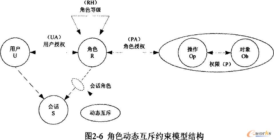 與角色靜態互斥約束類似,角色動態互斥約束也是限制可提供給用戶的訪問權限,但是實施的機制不同。角色動態互斥約束在用戶會話中對可激活的當前角色進行限制。在角色靜態互斥約束中,有沖突的角色不能被指派給同一用戶;在角色動態互斥約束中,有沖突的角色可以被指派給同一用戶,但是它們不能在同一個會話中被激活。角色動態互斥約束是最小權限原則的擴展,每個用戶根據其執行的任務可以在不同的環境下擁有不同級別的訪問權限,確保訪問權限不會在時間上超越它們對履行職責的必要性,這種機制稱作信任的適時變更。角色動態互斥約束的模型結構如圖2-6所示: