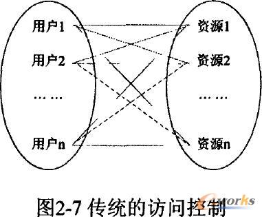 傳統的訪問控制策略直接將訪問主體與客體相聯系,如圖2-7所示: