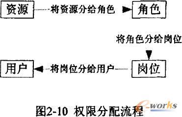 此模型在RBAC模型的基礎上增加了崗位(Post)這一集合,模型的主要組成元素有用戶集合(U),崗位集合(P),角色集合(R),信息對象集合(O)。這樣用戶直接和崗位對應,而一個崗位擁有一個或多個角色,角色擁有一個或多個資源。這樣系統管理員可以更加直觀地給工作人員分配權限。權限分配流程如圖2-10所示: