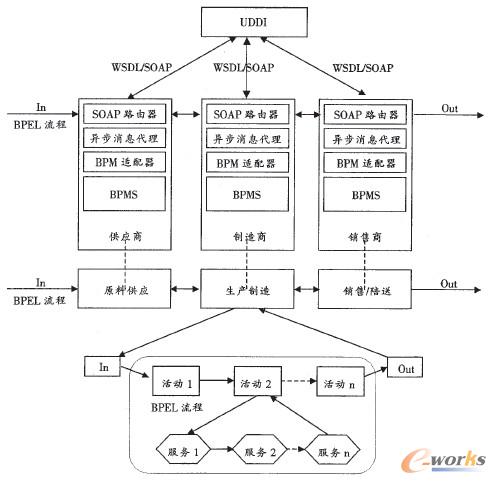 協同商務環境下的業務流程管理的最優執行模式是采用面向服務的架構(SOA)。SOA的精妙之處在于利用不同的服務元件來構建成一個異步分布的、 再生性強的系統, 而且能使這個系統既復雜精妙又價格便宜。協同商務中的每個企業對應的BPMS分別建立, 并由異類的業務流程引擎管理,在兩個參與者發生聯系的結合點由雙方協商解決(采用請求和服務模式)。