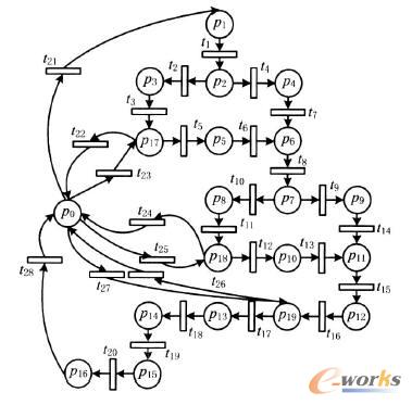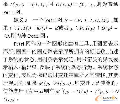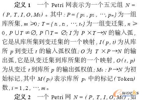 Petri網理論是由德國Carl Adam Petri博士于1962年提出的一種完善的圖形化數學工具,適于描述和分析具有同步、通訊、資源共享等特點的并發過程系統。下面首先介紹一些Petri網的基本概念和符號,更多信息可參考文獻[21]和文獻[22]。