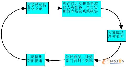 三菱的成功還歸功于它實施一開始定下的“由簡入難,由淺入深,分步實施”的信息化實施原則。這種分步實施大大降低了應用的風險,也減小了變革的幅度和因此帶來的阻力。而且三菱ERP系統初步實施中選擇的切入點選擇的好,從比較容易見成效的地方開始的原則。這使得它的ERP實施一開頭就有了良好的效果,好的開端帶來了后來的好的進展,形成了良性的循環,保證了項目的順利實施,從而達到了三菱今天的成功。如圖2所示: