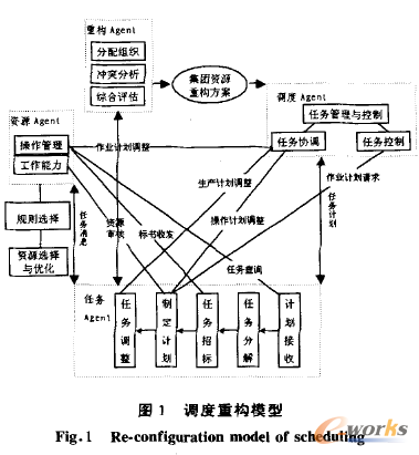 DRERP系統中的多Agent重構機制采用了合同網和啟發式規則相結合的協調方式來實現調度規則和策略的重構.該系統的資源調度重構模型如圖 1所示.在此模型中,調度Aegtn將生產計劃細化后生成任務Agent,并生成一個任務計劃,同時將有關信息告知任務Agent,消息內容的格式為:{作業名稱,單位作業的基本任務,任務所需資源表,期限,其他約束,任務標識}.