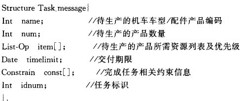 例如,當有新訂單計劃發生時,調度Agent:通過用戶接口接收新訂單,然后通過與其他Agent (銷售Agent生產計劃Agent、物供Agent、庫存Agent、采購Agent等)接口進行信息交互,經過成本Agent進行核算分析以及重構Agent確定的資源重構方案后(對機車產品零部件組成進行樹狀結構劃分后,系統規定產品關鍵部件,如轉向架、內燃機等的優先級最高),產生一個基本的生產流程計劃和資源調度計劃,并自動生成一個任務Agent,連同"生產任務消息"發送給任務Agent.以下給出Agent間業務交互的2個消息格式.其中,生產任務發布消息格式為: