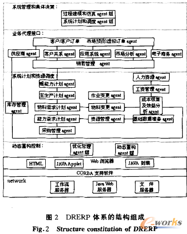由于分布、異構是集團化企業信息集成的基本特點,而CORBA是當前解決異構、協同、分布的主流技術之一,因此,DRERP系統采用 CORBA技術開發和構造相應的Agent,從而保證在異構平臺上支持異構數據的互操作.整個系統體系結構如圖2所示.