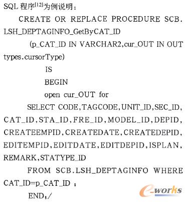這樣,應(yīng)用程序傳遞給數(shù)據(jù)庫的參數(shù)就只有PL/SQL程序名及p_CAT_ID一個(gè)參數(shù),數(shù)據(jù)庫處理后,就可以直接將查詢結(jié)果返回給應(yīng)用程序。數(shù)據(jù)交互變得簡單和高效率。筆者在該項(xiàng)目中,共建立了400多個(gè)不同功能的PL/SQL存儲過程序。降低了持久化層應(yīng)用程序與底層數(shù)據(jù)庫之間的耦合關(guān)系,使持久化層的編寫以及數(shù)據(jù)訪問、調(diào)用關(guān)系變得明了,簡單。其他PL/SQL程序類似,不在贅述。