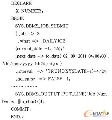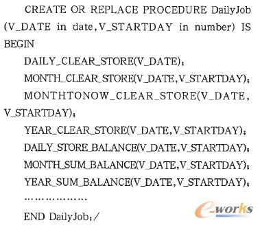 僅以庫房自動盤點(diǎn)程序?yàn)槔紫葘⑾鄳?yīng)分操作設(shè)計(jì)為不同的PL/SQL程序。例如DAILY_CLEAR STORE(V_DATE)負(fù)責(zé)進(jìn)行每日庫存增量計(jì)算,MONTH_CLEAR_STORE(V_DATE,V_STARTDAY)負(fù)責(zé)進(jìn)行每月庫存凈增量計(jì)算,MONTHTONOW_CLEAR_STORE(V_DATE,V_STARTDAY)負(fù)責(zé)進(jìn)行月初至今庫增量計(jì)算,YART_CLEAR_CLEAR_STORE(V_DATE,V_STARTDAY),STORE_BALANCE(V_DATE,V_STARTDAY)負(fù)責(zé)將最終庫存盤點(diǎn)的結(jié)果寫會數(shù)據(jù)庫指定位置,供用戶調(diào)用。然后指定一段存儲過程統(tǒng)領(lǐng)這些PL/SQL程序段執(zhí)行數(shù)據(jù)及參變量。