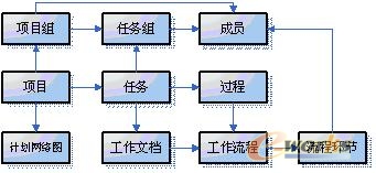 項目管理是一種為了在確定的時間范圍內,完成一個既定的項目,通過一定的方式合理地組織有關人員,并有效地管理項目中的所有資源(人員、設備等)與數(shù)據(jù),控制項目進度的系統(tǒng)管理方法。為了實施一個項目,需要執(zhí)行項目規(guī)劃、制定進度計劃、過程監(jiān)視和分析等步驟。作為PDM系統(tǒng)的項目管理模塊,它主要是圍繞企業(yè)產品的開發(fā)設計來組織項目的。一個項目往往需要分解成幾個任務,而一個具體的任務又由它包含的若干個工作文檔來確定。項目對象需要利用任務對象和工作文檔對象來確定項目的結構。為了項目的順利進行必須組織開發(fā)團隊進行協(xié)同工作,因此一個項目還應該有項目組、項目負責人、項目成員等對象。項目、任務、工作文檔對象可以與一個項目日歷對象相關聯(lián),以便進行項目的實際進度和目標進度的比較。其中工作流的作用是對整個產品的形成過程進行控制,實現(xiàn)參與項目人員的協(xié)同控制,提高效率。項目的實施包含一個完整的過程鏈,該過程鏈包括開發(fā)、試驗、生產等各個階段。工作流模塊不但可以應用于整個產品的過程鏈,而且還可以與項目的每個任務進行關聯(lián)。任務中的每一個工作文檔執(zhí)行完相應的流程后,任務才可以進行提交驗收的工作。工作流程不但明確了一個工作文檔的執(zhí)行程序,還把流程中的每一工作環(huán)節(jié)的工作任務分配給特定的項目組或任務組的成員。項目管理的概念模型圖如圖2所示。