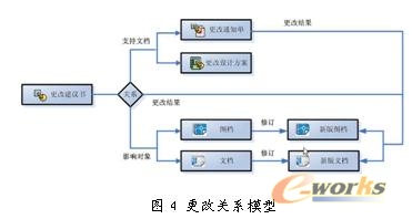 工程變更是生產過程中經常出現(xiàn)的重要活動,在一個企業(yè)中,工程變更往往有規(guī)范的過程約束與流程控制,所以它與工作流管理總是密不可分的。工程變更管理是指對已發(fā)布(歸檔)的產品設計和開發(fā)結果的變更。必須先由更改申請人員提出更改請求,并填寫相應的設計更改建議書,提交有關人員會簽通過后,最后才能交由更改人員完成設計文件的更改。整個工程變更流程由設計更改建議書來驅動,本企業(yè)的設計更改管理業(yè)務流程和更改關系的模型分別如圖3和圖4所示。
