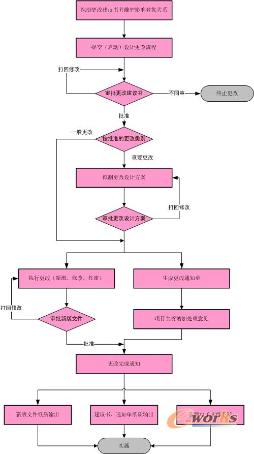 工程更改過程本身就是一個特定的工作流,它有申請、評審、實施、通知更改等幾個基本環(huán)節(jié),而這幾個基本環(huán)節(jié)又包含了更詳細的步驟。如對更改建議書的會簽必須確定會簽的人員,通過對更改建議書的審批,然后進行簽發(fā)。同時,被更改的設計文檔必須與設計更改建議書建立關聯(lián)關系,在設計更改建議書會簽完成的同時獲得設計文檔版本升級的權限,并自動將升級后的文檔提交相應的流程。如果更改過程產生了新的設計文檔,也需與更改建議書建立關聯(lián)關系,在建議書的審批完成后驅動新文檔的審批流程。相應的更改通知單由PDM系統(tǒng)自動生成。