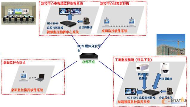 (4)在大型工地塔吊等不便埋線的監控位置,安裝微波收發設備及IP Camera網絡攝像機,其他位置安裝光纖接入的模擬監控攝像機;配置1臺MGS媒體網關服務器為當地局域網內的網絡攝像機提供媒體轉接服務;使用1臺NDS1000監控指揮終端,接入室內會議攝像機,對本地工地畫面進行監看的同時,也可進行視頻會議并被遠程監看;