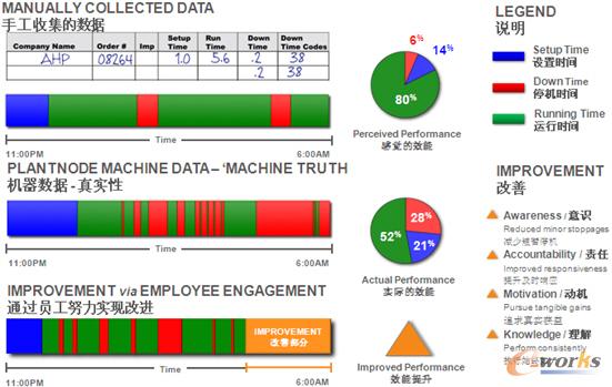 圖3是兩個不同的數(shù)據(jù)收集方式的比較,上面是手工收集的數(shù)據(jù),下面是機器自動采集的數(shù)據(jù)。從手動收集的數(shù)據(jù)可以看到,機器的設(shè)置時間很短,但是實際上從自動采集的數(shù)據(jù)來看,機器的設(shè)置時間是很長的,原因是存在一些小的空閑時間。從停機時間來看,手工收集的數(shù)據(jù)也很短,而自動收集的數(shù)據(jù)則很長。一天工作下來,回顧一下生產(chǎn)運行狀況,會發(fā)現(xiàn)實際設(shè)備運行的時間只是52%,不是手工采集數(shù)據(jù)認為的80%。所以這樣比較下來會發(fā)現(xiàn)需要進行大量的改善,比如提高員工的意識,增加員工的責任心,增加員工工作動機,增加員工的產(chǎn)效,和對企業(yè)效能的理解,從而就可以實現(xiàn)OEE指標的提高。