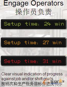 如圖4我們可以用LED顯示整個操作的過程,可以讓操作員看到,也可以在產(chǎn)線上看到,比如說SETUP的模式是24分鐘,用綠色表示;如果超出這個標準但是在允許的一個范圍內(nèi)的話,用黃色表示,這樣員工就可以看到機器SETUP的時間過長;如果再超出,就用紅色顯示。通過LDE顯示,可以增加員工的責任感,以及工作一天下來的成就感。