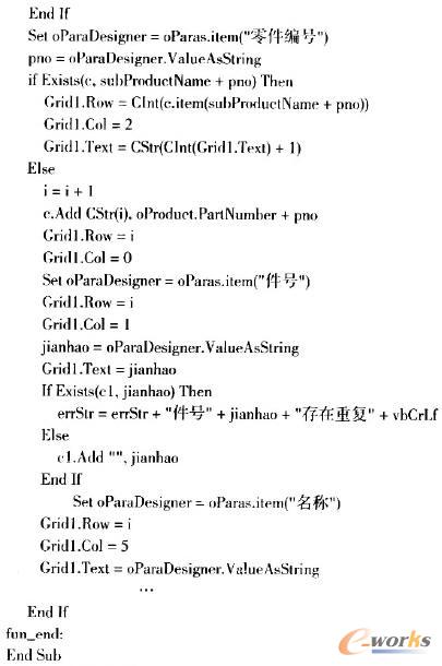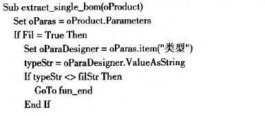 提取并統(tǒng)計(jì)單個(gè)零件的BOM信息的工作由一個(gè)函數(shù)extract_single_BOM完成,首先通過參數(shù)的Parameters方法獲得要提取的屬性對的集合。其中選取出類型參數(shù),與預(yù)先在界面上選取的類型比較,若不是則不提取該節(jié)點(diǎn)中的屬性。在統(tǒng)計(jì)過程中,建立以零件編號為鍵值,網(wǎng)格中顯示的行號作為值的hash表全局變量,提取屬性時(shí)提取出零件編號,在建立的hash表中檢索。若已經(jīng)在表中存在,則認(rèn)為是已經(jīng)出現(xiàn)過類型的零件,可以從對應(yīng)的值取出行號,將對應(yīng)單元格的值加一;若獲在表中沒有,則將當(dāng)前行值加一,并將鍵值對添加到hash表中,以便后續(xù)重復(fù)元素統(tǒng)計(jì)修改對應(yīng)行的值。