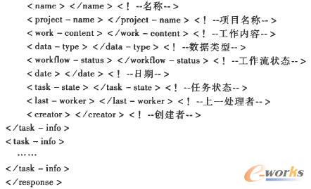 (4)登錄PDM系統(tǒng)后,查詢該用戶的當前工作,然后組織成XML信息返回給OA系統(tǒng),其XML格式如下: