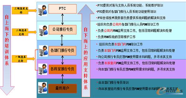 為將PDM系統有效、有序地推廣應用,確保PDM用戶熟練操作PDM系統,公司內部舉辦PDM系統全面推廣培訓。以項目為單位,先項目組,后職能科室。建立其自上而下的培訓體系,培養核心PDM應用骨干,同時形成自下而上的推廣應用技術支持體系。