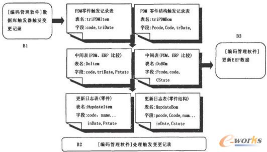 一般企業都是以PDM為主動,ERP為從動,建立中間數據緩存處理的方式實現PDM與ERP的數據集成,圖1描述了PDM與ERP數據集成的過程。圖1中A和B分別描述了兩種從動方式:A方式是以PDM產品或零部件為基準映射到ERP中。B方式是通過對PDM數據監控將數據變化的結果更新到ERP中。這兩種方式都是通過編碼管理軟件計算出如何變化并標志狀態,根據狀態自動更新ERP,而且在更新過程中設置了很多規則和約定,可能是編碼的變化(如根據工藝編碼標準追加工藝狀態碼),也可能是相關數據的計算并更新(如根據零件性質確定庫房和加工中心等),這些規則是根據企業內部ERP的實際情況而定的,這些方法和過程要經過一段時間的調整、磨合才能穩定下來。