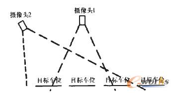 本文采用USB攝像頭對(duì)停車(chē)位進(jìn)行視頻采集,通過(guò)圖像處理技術(shù),對(duì)橢圓特征信息進(jìn)行提取,確定停車(chē)位的使用情況,如圖1所示。與攝像頭被安放在待檢測(cè)車(chē)位的正上方(如攝像頭1)相比,把攝像頭安放在車(chē)位的斜前方通過(guò)增加偏移角度和拍攝距離增大可視范圍,獲取更多的檢測(cè)車(chē)位(如攝像頭2)。