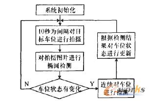 對(duì)系統(tǒng)的狀態(tài)進(jìn)行初始化后,經(jīng)橢圓檢測(cè)后對(duì)停車(chē)位設(shè)置一個(gè)標(biāo)志位,每次當(dāng)車(chē)位變化的時(shí)候,改變?cè)摌?biāo)志位。即每次對(duì)車(chē)位狀態(tài)進(jìn)行判斷的時(shí)候,首先將結(jié)果與系統(tǒng)中保存的狀態(tài)進(jìn)行比較。當(dāng)檢測(cè)結(jié)果發(fā)現(xiàn)狀態(tài)變化時(shí),不能簡(jiǎn)單的更改車(chē)位的狀態(tài),需要進(jìn)行多次檢測(cè)(5次),并且不再以10秒為單位進(jìn)行判斷,而是每次檢測(cè)完就直接拍攝下一張圖片判斷,通過(guò)統(tǒng)計(jì)對(duì)檢測(cè)結(jié)果判斷車(chē)位是否有變化,以防誤判。