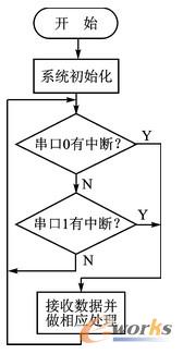 單片機在主程序中循環查詢兩個串口是否接收到新的數據,當任意一個串口產生中斷時,根據串口接收到數據的含義,采取相應的操作。主函數流程如圖2所示。