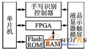 選擇附有觸摸屏的液晶顯示器,將觸摸屏外接手寫識別控制器,就可以增加手寫識別功能,可提供友好的人機交互界面。由上述分析可以畫出系統框圖,如圖1所示。