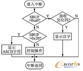 通過PC機鍵盤進行界面操作時,使用電腦軟件將鍵盤的操作鍵值通過PC機串口發送給單片機串口0.單片機串口0每中斷一次接收到一個字節的數據,接收到的數據可分為3種情況:數值大于0xA0時,說明該字節是某漢字兩字節數據中的一個字節;數值為0x20~0x7f時,表示該字節是可打印的ASCII碼字符;數值小于0x20時,表示該字節是不可打印的數值,可用這36個數值作為界面操作的控制命令字節。連續接收完兩個數值大于0xA0數據時,就可以轉換成某個漢字;每接收到一個數值為0x20~0x7f的數據時,就可以轉換成某個ASCII碼字符;每接收到一個數值小于0x20的數據時,就可以翻譯成某個操作命令,進行相應的控制操作。圖4為鍵盤接口操作中斷流程。