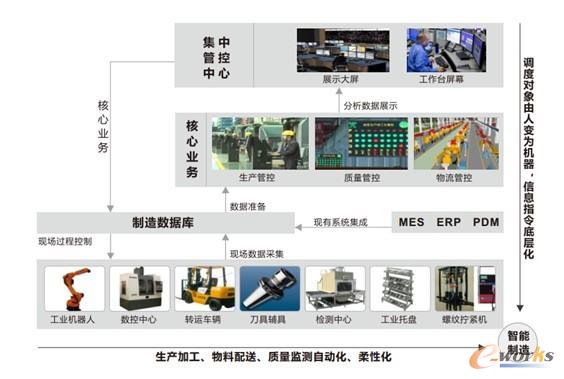- 通過對數控設備、工業機器人和現場檢測設備的集成,實時獲取制造裝備狀態、生產過程進度以及質量參數控制的第一手信息,并傳遞給執行層與管控層,實現車間制造透明化,為敏捷決策提供依據;