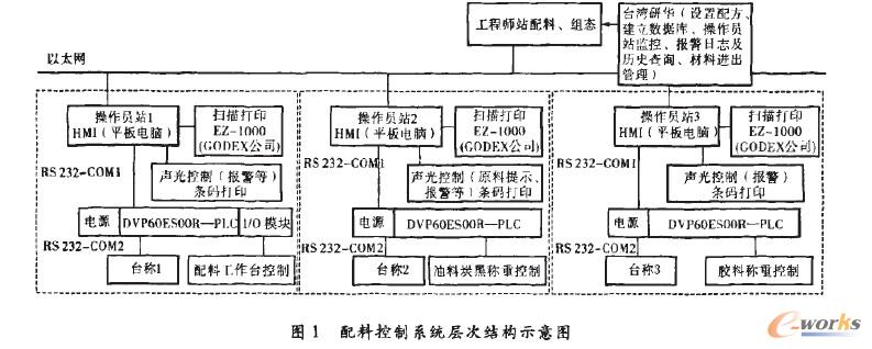 配料控制系統由一個工程師站和3個操作員站組成,其中工程師站作為主站,操作員站為分站。操作員站分別為小料操作員站、炭黑油料操作員站和膠料操作員站。主站系統通過以太網將具體配方按各操作員站所能實現的功能進行分解,并發送給操作員l、2、3,作為電子配料依據(操作員站無權修改配方和配方編號)。操作員站依據具體配方進行電子配料。